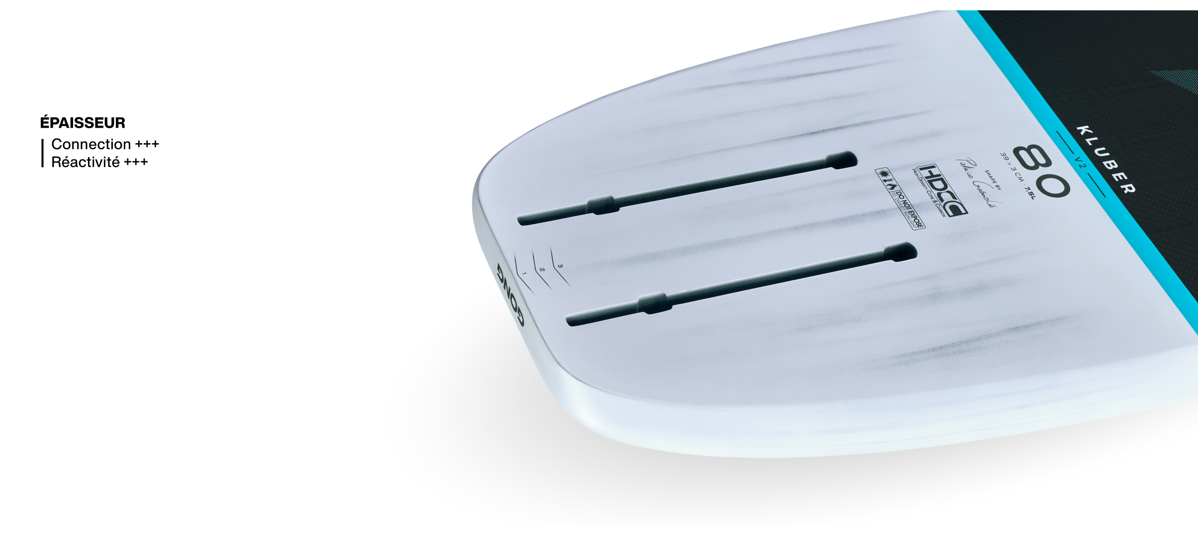 Avec un rocker très tendu, le pumping est plus efficace et offre une assiette parfaite pour faciliter et optimiser chaque appui, pied avant bien à plat sur le deck. Il permet également l’utilisation de toute la longueur de la Kluber en fonction de son gabarit et de son stance.