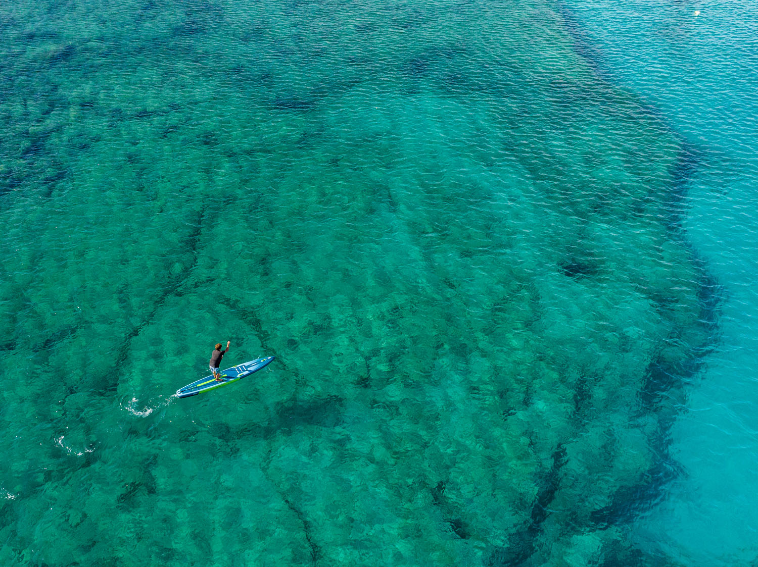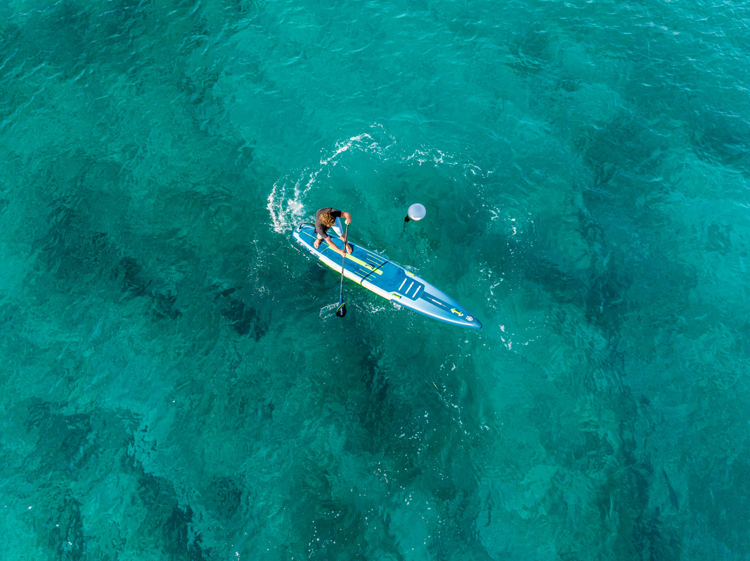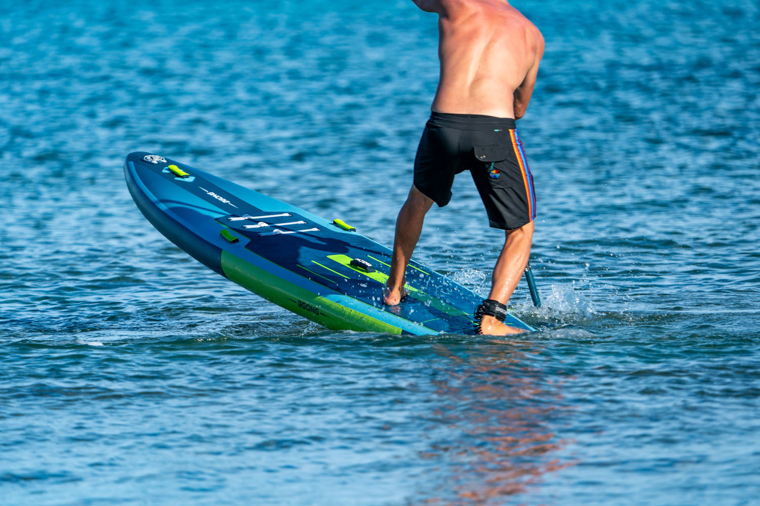 Sur les vagues ou sur la houle, le take off est précoce car la répartition du volume d’une gonflable la fait démarrer tôt sur l’onde. Son square tail bien volumineux permet de se reculer en surf ou en downwind. Une fois reculé, c’est stable et ça glisse tout seul !