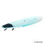 Le volume est délicatement réparti avec une dominante juste devant les pieds à la rame pour garder un tail fin et distribuer le volume exactement où vous en avez besoin. Pas d’inquiétude sur l’épaisseur des rails à ce niveau car le plan de pont domé efface le volume à proximité des rails sur cette planche large.