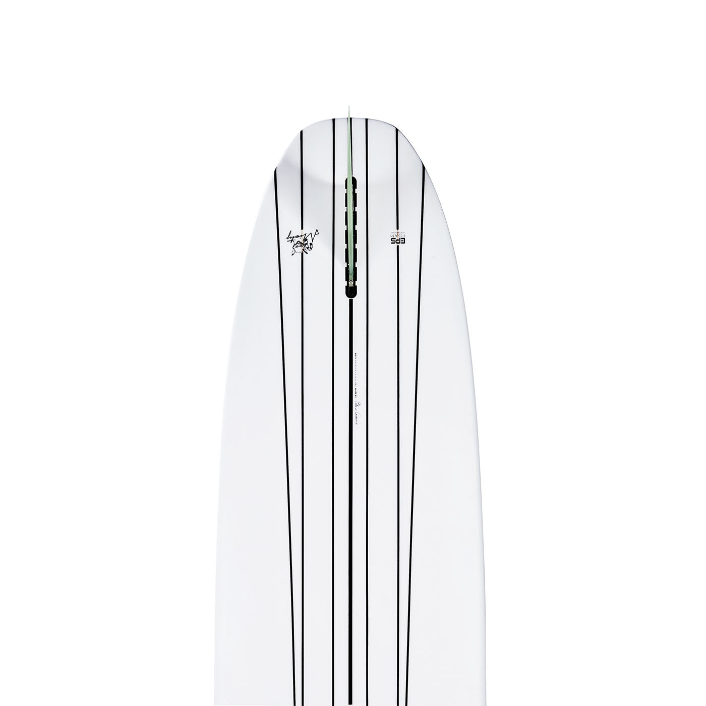 Ce tail large accumule une grande quantité d’eau lorsqu’on est au nose, offrant un effet de levier puissant qui stabilise et relève automatiquement le nose de la planche. On se retrouve ainsi porté dans un équilibre parfait, avec une trajectoire naturellement maintenue sur ou au-dessus de la trim line.