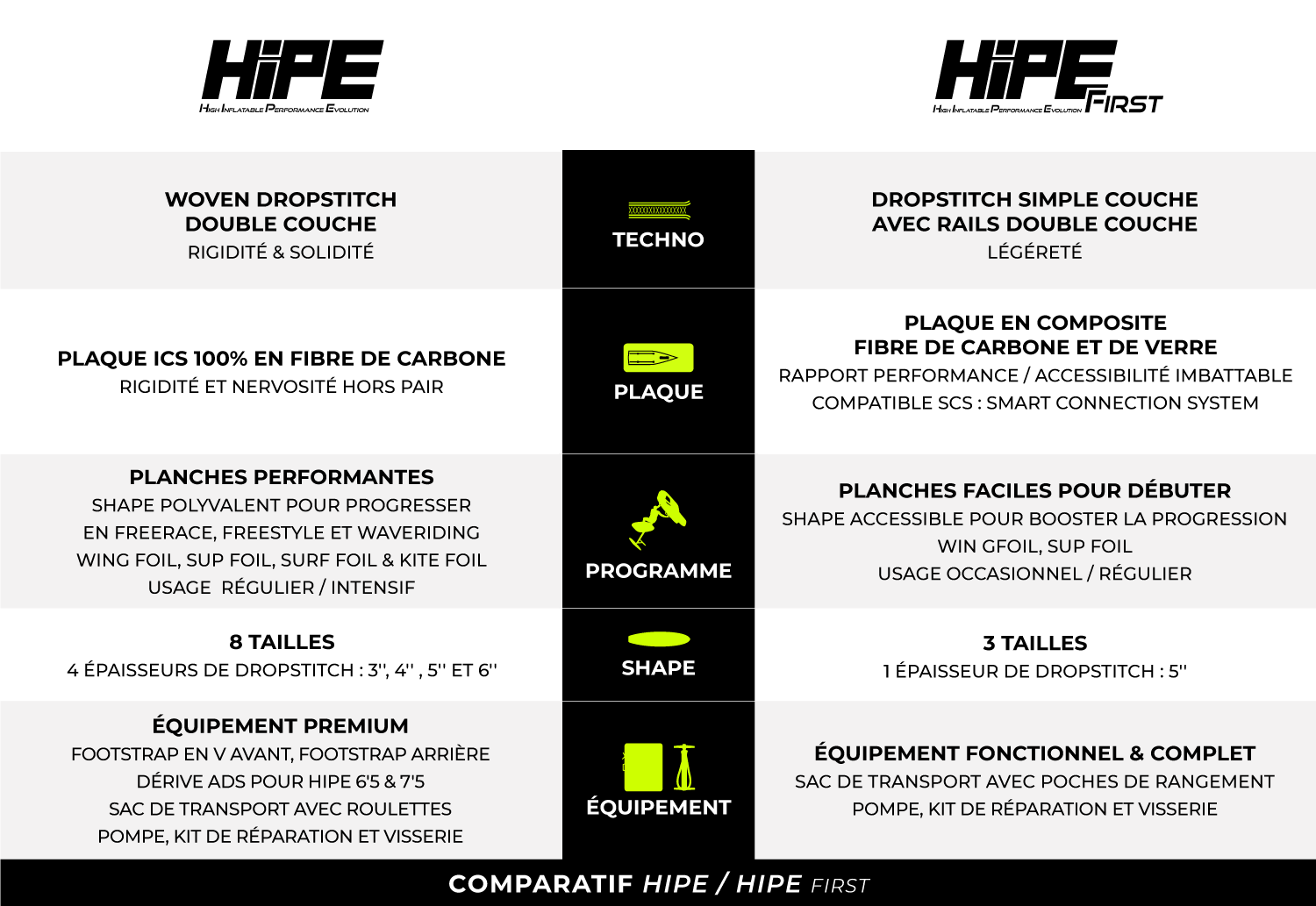 - HIPE Pro : le gonflable avec 95% des perfs du rigide avec un shape dédié aux foileurs expérimentés qui souhaitent une fluidité et réactivité maximale !