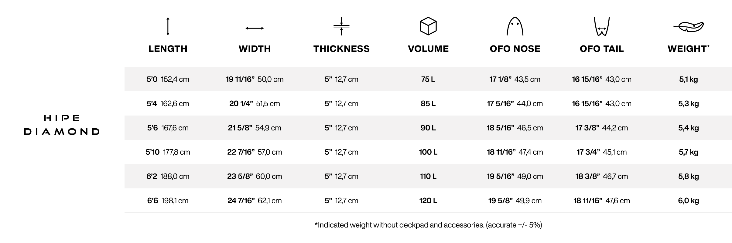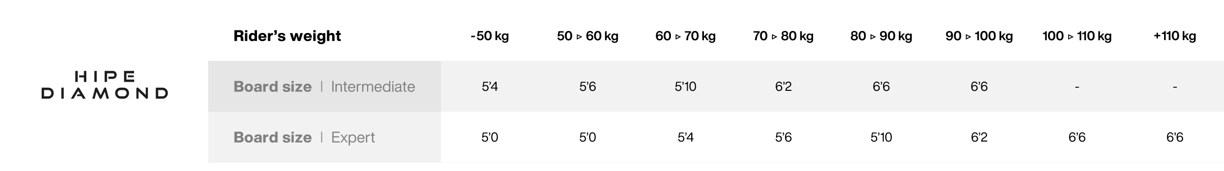 Disponible en six tailles, de 5’0 à 6’6 (75L à 120L), la HIPE Diamond couvre les gabarits et les programmes en wing lightwind, freeride, freefly, downwind/freesurf et lowkite, avec une logique simple : conserver une planche rapide, saine et glissante, facile à emmener partout.