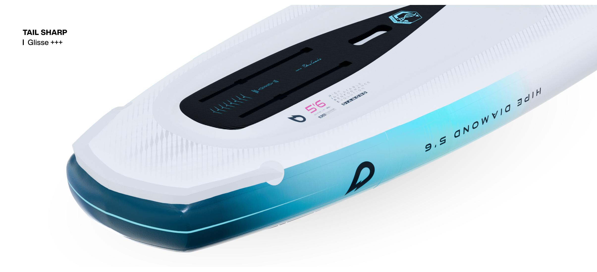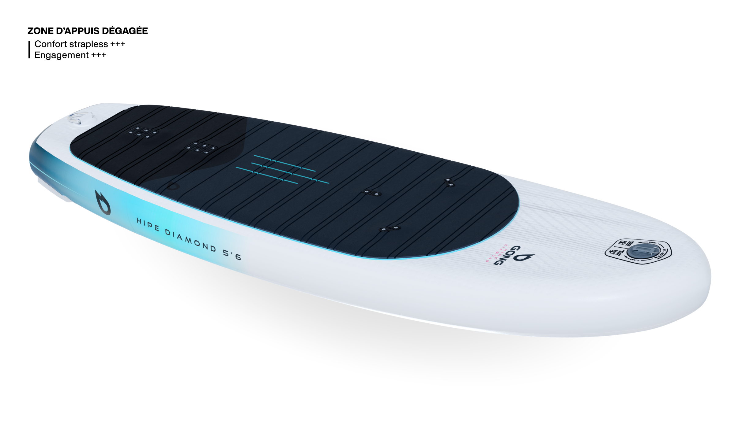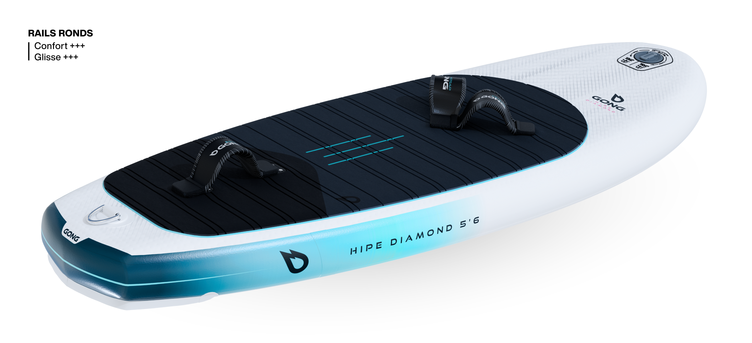Comme toutes les HIPE, la Diamond s’appuie sur la technologie hybride GONG : une base rigide en composite pour la tenue et la précision, associée à un volume gonflable en dropstitch pour la tolérance, la sécurité et la facilité de transport. La plaque ICS apporte une rigidité de référence, sans flex ni twist parasites, pour une sensation très proche d’une planche rigide, avec une durabilité impressionnante. L’optimisation de poids initiée en 2025 se ressent tout de suite en main, et participe directement au confort d’usage au quotidien.