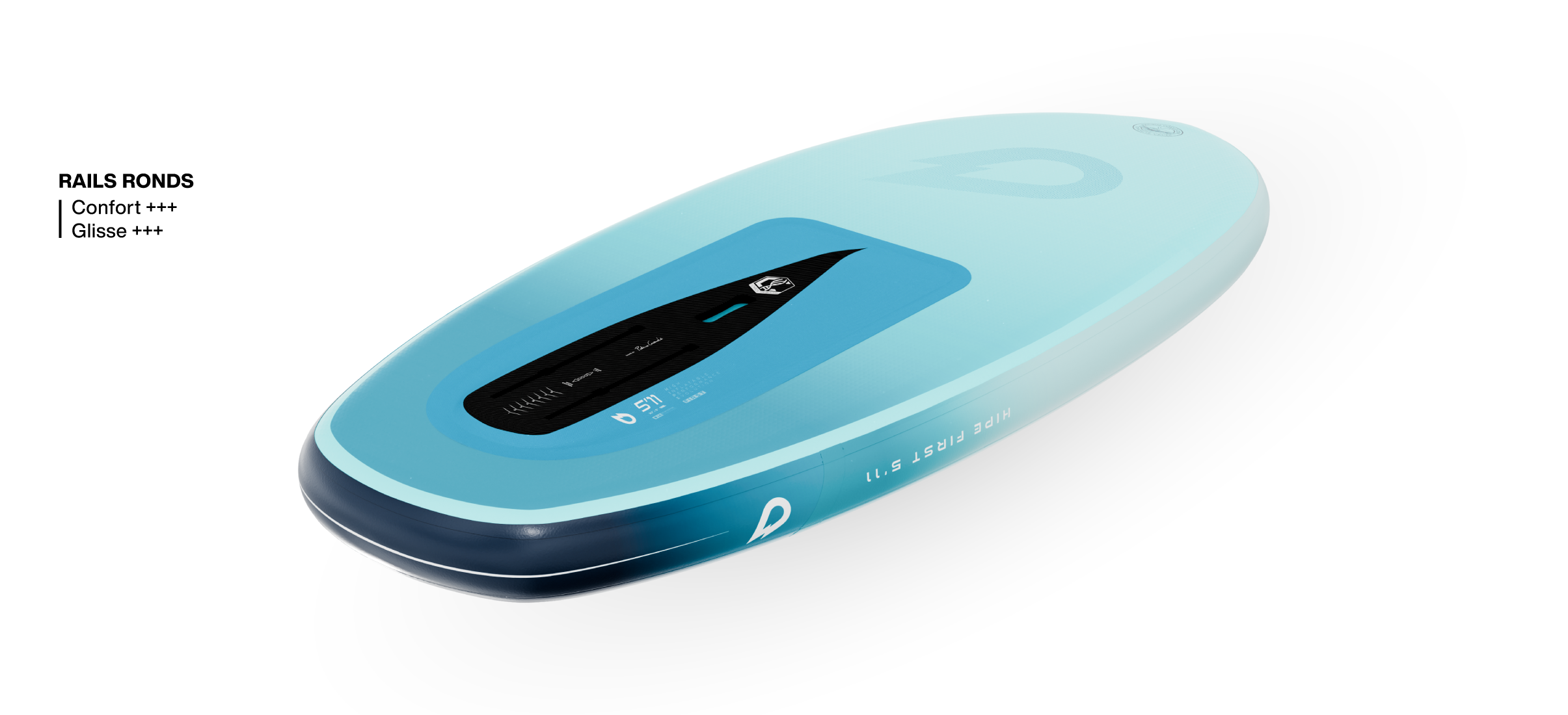 Les rails sont ronds, comme sur toutes les planches gonflables. Mais nous avons utilisé ce shape naturel pour aider l’eau à glisser sur la board. L’eau ne colle pas aux rails.