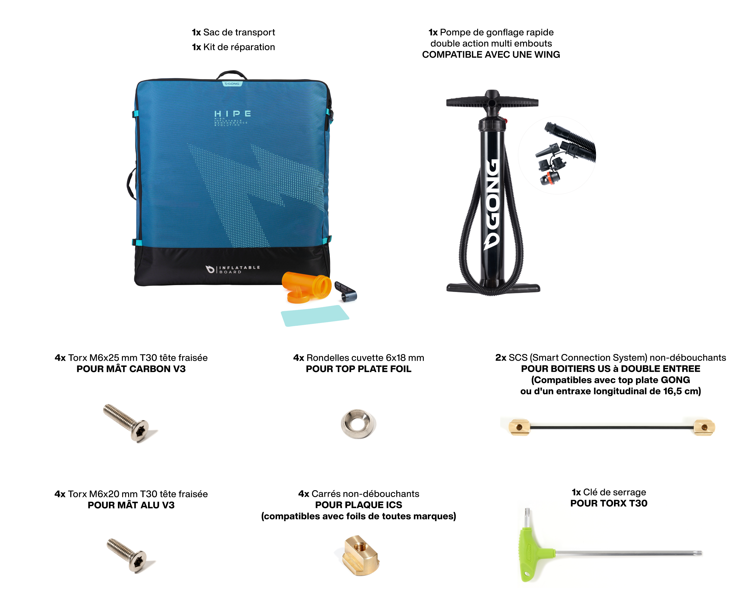 - Pompe de gonflage rapide double action multi embouts (compatible avec une wing).