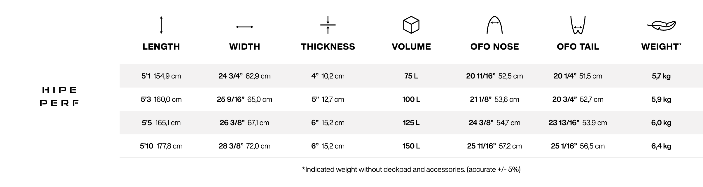Cette version de la HIPE Perf est dédiée à 100% au WingFoil, avec une recherche de glisse et d’efficacité. Les tailles ont été recentrées de 5’1 à 5’10 (75L à 150L) pour couvrir les gabarits qui veulent à la fois accessibilité, performances et praticité. Son poids reste contenu, sous les 6,5 kg, ce qui fait une vraie différence au quotidien : portage, mise à l’eau, remontée au vent sur la plage, et confort général en progression.