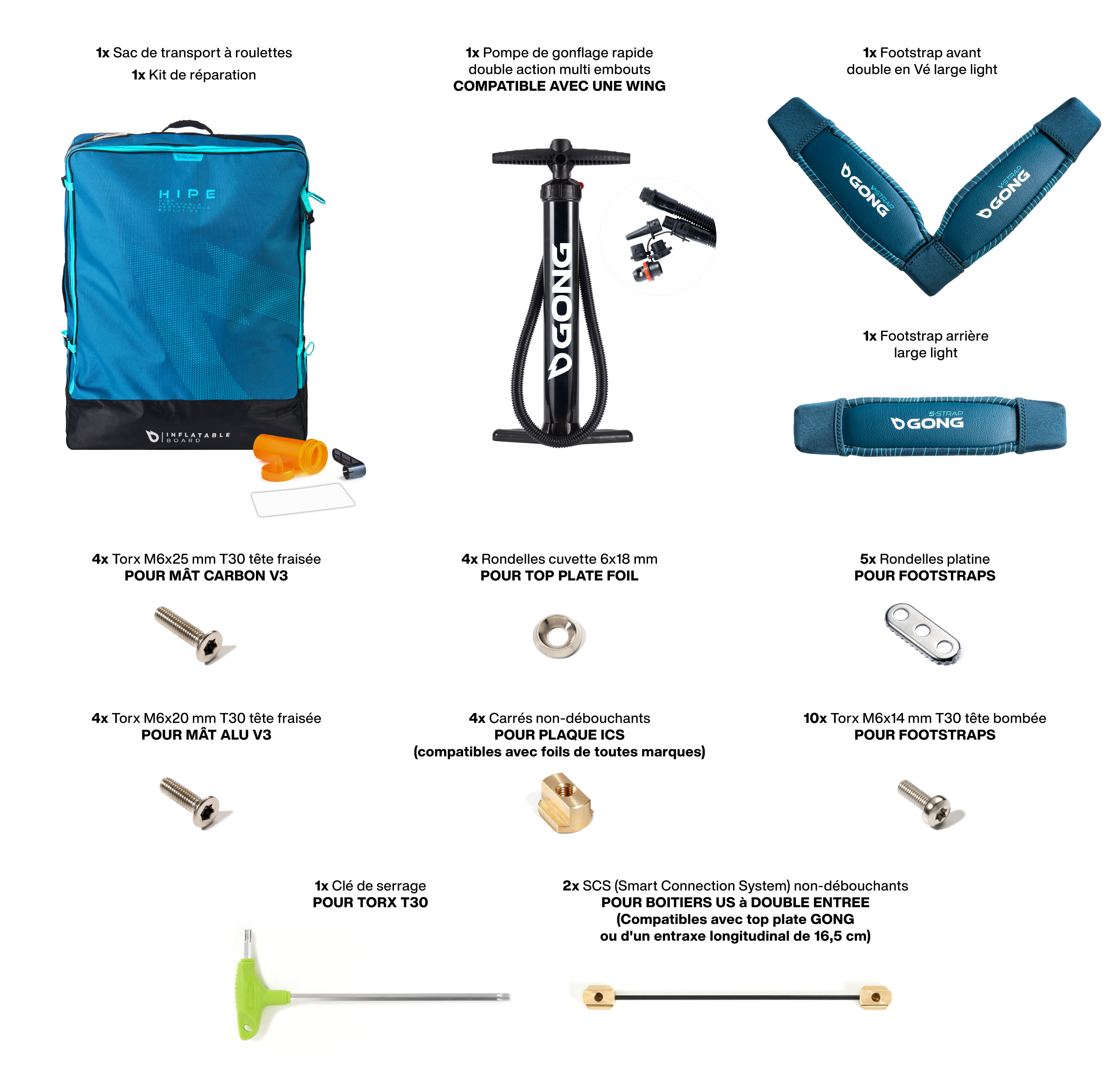 Toute la visserie pour les straps et la top plate du foil est fournie avec la planche.